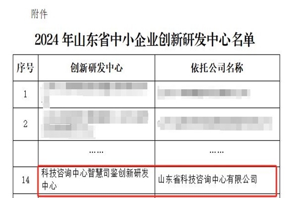 12月9日,省輕工聯(lián)社、省中小企業(yè)發(fā)展促進(jìn)中心公布了2024年山東省中小企業(yè)創(chuàng )新研發(fā)中心名單,公司創(chuàng )新研發(fā)中心“科技咨詢(xún)中心智慧司鑒創(chuàng )新研發(fā)中心”成功入選。